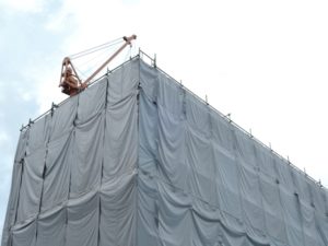 シートの設置は工事範囲を囲むように行うことが多く、高所作業が必要になる場合もあります。安全対策と合わせて計画することが求められます。